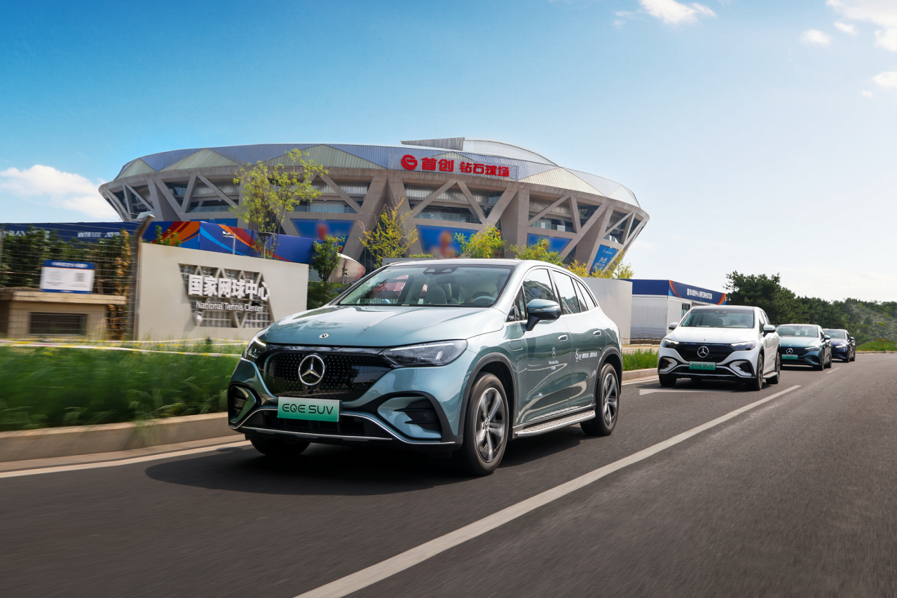 与场内激烈赛事相呼应,梅赛德斯-奔驰官方礼宾车队在场外同样成为了一道亮丽风景。赛事期间,由EQE、EQE SUV组成的赛事礼宾车队,为来自世界各地的贵宾及球员提供了舒适、贴心的绿色品质出行服务,展示着中国高端汽车制造的不凡实力。